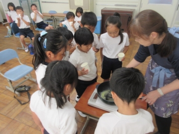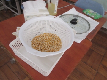2年生が生活科の学習で育てたとうもろこしを使って、ポップコーンづくりをしました。定番の塩味に加え、カレー味などオリジナルの味付けもありました。硬くて実を取るのに苦労していた子もいましたが、あの硬い実がはじける様子は、子どもたちの目にも新鮮に映ったようです。自分たちで育てたものをおいしくいただくまでには、時間をかけてお世話をしながら育てることの大変さを改めて感じることができました。
