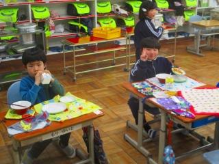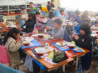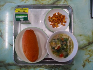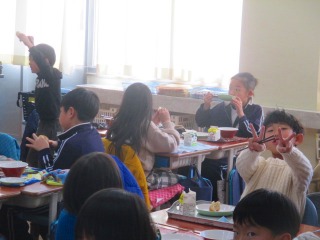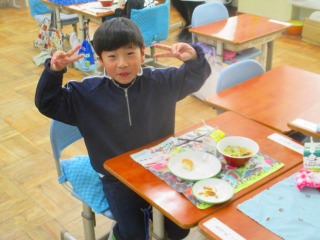 昨日と本日は、「みえ地物一番給食の日」でした。本日の献立は、「小型玄米パン、牛乳、鶏なんばうどん、さつまビーンズ」でした。「鶏なんばうどん」に、しいたけ、油あげ、白菜、小松菜、が入っていて、三重県産の食べ物でした。他にも牛乳、大豆が三重県産の食べ物でした。「鶏なんばうどん」には、具がたっぷり入っていておいしくいただきました。