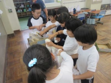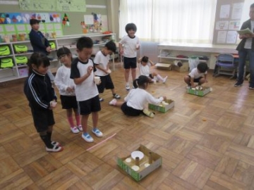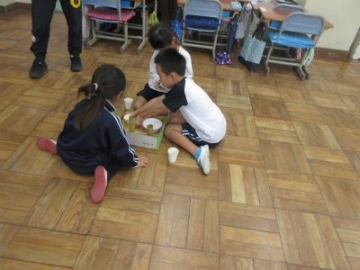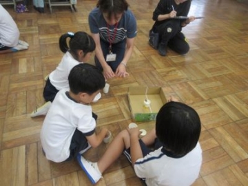 生活科の学習で、どんぐりを使ってみんなが楽しめるおもちゃ作りを楽しんでいます。今日は、初めて班のみんなでアイデアを出し合いながら、「まといれゲーム」をつくる学習をしていました。「どこに的を置くとよいか」「何点にしようか」大小の紙コップやペーパーの芯など、間口の大きさがそれぞれ違う的を選んで、土台にセットしていきました。「これは入れにくそうだから100点」「投げるところから一番近くだと、入りにくいんじゃないかな?」子どもたちは、相談しながら「まといれゲーム」を仕上げていきました。お試しゲームが始まると、みんな真剣。「やったあ、入った」「うわー、0点だった」と自分たちで作ったゲームに夢中になっていました。自分の意見ばかり通すのではなく、仲間の意見も取り入れながら、学習を進めることができました。