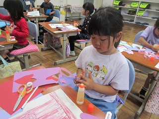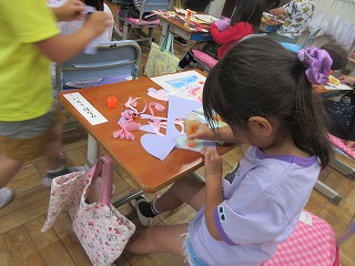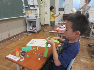 図画工作科の授業の様子です。画用紙を丸めて、大きな帽子を作ります。今日は、どんな飾りをつけようか、イメージしたことを作品にしていきました。イメージ図を見ながら、画用紙の色を選んだり、はさみで切ったりしながら、飾りを作りました。細かい作業もどんどん進めていきます。どんなオリジナル帽子ができるのでしょうか。出来上がりが楽しみですね!