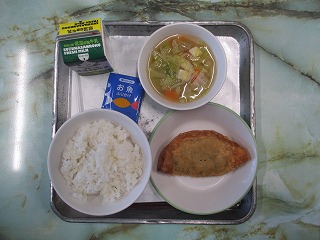 1月24日(金)~30日(木)は「全国学校給食週間」で、本日は「平成」の時代の給食メニューでした。献立は、「米飯、魚ふりかけ、牛乳、津ぎょうざ、魚めんのスープ」でした。現在の給食は、地場産物や郷土料理、外国の料理など、バラエティ豊かな献立となっています。本日の「津ぎょうざ」は、津市の学校給食で誕生したメニューでした。ふっくらとやわらかく、ボリュームがあって、とてもおいしくいただきました。