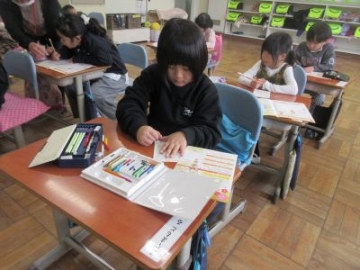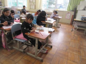 1年生が国語の時間に、年賀状を書きました。送りたい人に、どんな新年のご挨拶を書くか、予め考え、清書をしました。教室に入ると、静かに集中して取り組む1年生の子どもたち。書かれている字も、とても丁寧でした。入学から2学期までの間に、しっかりと成長した姿を見せてくれていました。