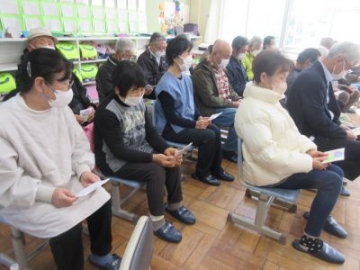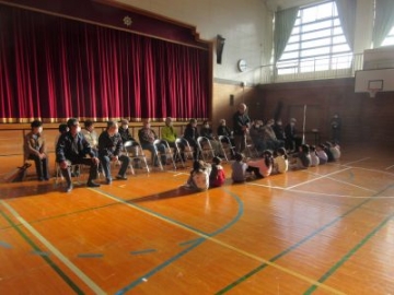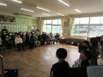 最後に、1年生から、歌と合奏、そして大事に育ててきた朝顔の種とメッセージをプレゼントしました。子どもたちの歌声や合奏を温かく見守っていただき、子どもたちも精一杯、歌ったり合奏したりすることができました。挨拶をして終わり…かと思ったら、なんど、白寿会の皆様から竹とんぼのプレゼントがありました!子どもたちも大喜びです。お帰りになる時には、子どもたちからかけ寄って挨拶をしたりお見送りをしたりする姿は、今日の活動が子どもたちにとって、素晴らしい機会となったことを物語っていました。「子どもたちから元気をもらった」と素敵なコメントもいただきました。     |
