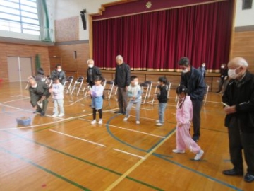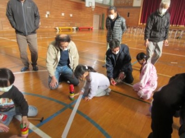 1年生が、白寿会19名の皆様から、子どものころの遊びを教えていただきました。体育館であいさつをした後、早速、体育館と教室の2か所に分かれて活動開始です。体育館では、竹とんぼ、だるま落とし、こま回しです。やり方を教えていただくと、子どもたちもすぐに挑戦し、できるようになってきました。こま回しは、少し難しかったようですが、白寿会の方々の見本がとても素晴らしく、床で回っているこまをひもでひっかけて、手のひらで回すなど、いろいろな技を見せていただきました。子どもたちからも「すごい!」と感嘆の声が上がっていました。教室では、ヨーヨーやお手玉、けん玉を教えていただきました。こちらも楽しみながら、どんどん上手になっていきました。