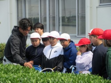 少し風は強かったですが、青空の下、6年生が学校茶園で茶摘みに取り組みました。まずは、JAの職員の方々に茶の手摘みの仕方を教えていただきました。「一芯二葉を摘み取ってください。新しく出てきた芽とその下にある2枚の葉を丁寧に摘み取ってください。」子どもたちは、茶園に入ると、教えていただいた「一芯二葉」を上手に摘み取り始めました。最初は、「これでいいのかなあ」と不安そうな表情もありましたが、それもつかの間。どんどん摘み取り、腰に付けたバケツがいっぱいになりました。私たちが口にするお茶も、たくさんの人がかかわり、たくさんの時間を費やし、お世話をしていただくことで、おいしいお茶になります。手摘みをする大変さを実感するとともに、茶業に関わる方々の工夫や苦労を学ぶことができました。       |