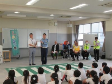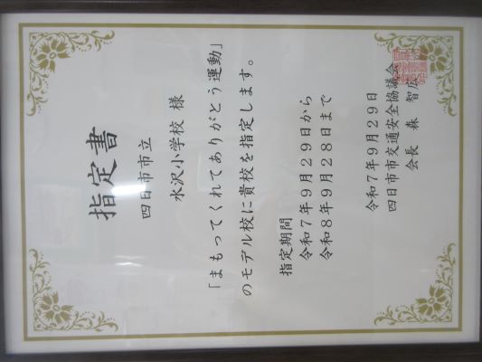とみまつ隊による交通安全指導を受けました。「ありがとう」の気持ちが運転手さんに伝わることが大切だと学びました。 式典後には、低学年の下校指導を行っていただきました。子どもたちからはさっそく、「ありがとうございます!」「さようなら」と大きな声であいさつができました。 指定書です。校長室の前に掲示しました。