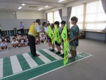 6年生代表児童が、横断旗を受け取りました。交通安全指導などで活用させていただきます。