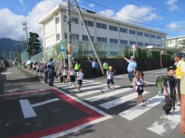 「まもってくれてありがとう運動」は、横断歩道を渡るときに、停止してくださった自動車などの運転手の方に「ありがとう」と感謝の気持ちを伝えることで、車両を運転する方も歩行者もともに、交通安全意識を高めるとともに、交通事故を防止するということがねらいです。 今日の5限めには、四日市市交通安全協議会事務局、西警察署、四日市市交通安全教育指導員の方々や水沢駐在所から朝の登校でもお世話になっている警察官の方にもお越しいただき、モデル校指定式を行いました。本校は、今日の指定式から1年間、モデル校となります。子どもたちの「ありがとう」が、水沢地区の交通安全を守ることにつながるよう一人ひとりが意識をして取り組んでいってほしいと思います。