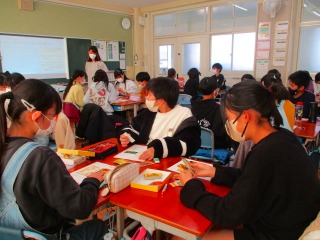 小学校最後の食育の授業は、「お弁当作りについて考えよう」というテーマの授業です。お弁当作りのポイントとして、「お弁当箱のサイズは食べる人の大きさに合ったものを選ぶ」「移動しないようにしっかりつめる」「しっかり手を洗って衛生面に気をつける」「いろどりよくつめる」「主食・主菜・副菜=3:1:2のバランスでつめる」が大切であると分かりました。