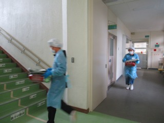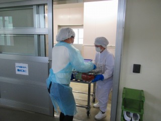 3月8日(土)~18日(火)の期間、給食ワゴンを2階や3階に上げるための小荷物専用エレベーターの改修工事をしています。この期間は、ワゴンを上げることができないので、運搬専門の業者の方に給食を運んでもらっています。