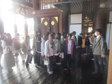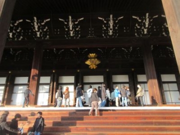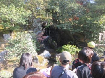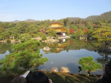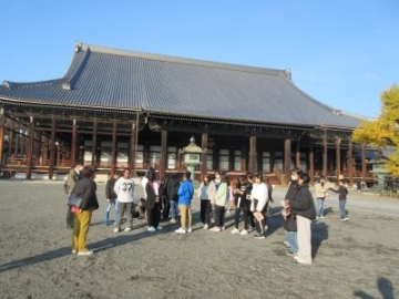 21日(金)2日めの朝がやってきました。朝ご飯をいただき、退館式を行った後は、西本願寺の周辺や境内などの見学をしながら、朝の散策をしました。  2日めも穏やかな晴天に恵まれ、とても気持ちの良いスタートとなりました。お堂の様子や渡り廊下を歩きながら、その広さを実感しました。廊下を歩くと「きゅっ、きゅっ」という音をききながら、「昔はこれで敵が来たことがわかったのかな」と話している子もいました。     旅館を出発し、次の目的地は金閣寺です。バスの中では、ガイドさんから3階建てのそれぞれの階で建築様式が違うことや正式名称など、事前に見学のポイントや知識を教えていただきました。幸い、思ったより観光客が少なかったため、班ごとに写真を撮ることもスムーズにできました。風が穏やかだったので、池に映る金閣の様子は、班ごとに持っているカメラで撮影をしていました。龍門滝や夕佳亭など、境内の様子も時間をかけてじっくりと見学できたことは、幸運でした。     |