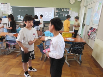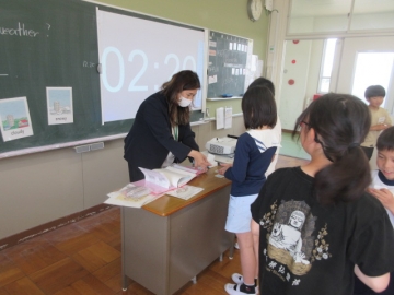 外国語や外国語活動の時間には、英語指導員の先生による授業が行われます。4年生では、”天気”の尋ね方を学習をしていました。1人が「How's the weather?」と尋ねると「It's sunny.」と自分のカードの天気をを答えます。2人とも同じカードだと、新しいカードをもらうことができます。「やったあ、そろった」英語での会話を楽しみながら活動していました。