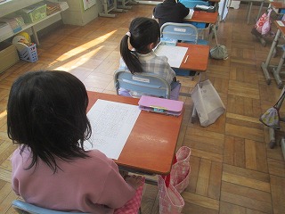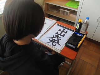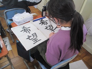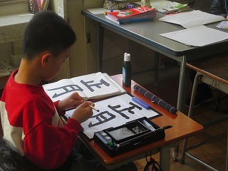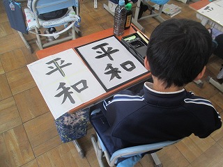 全学年が、本日2,3限目に新年試筆(書き初め)を行いました。冬休みの期間中に家庭で取り組んだ課題に挑戦しました。1年生は「スイミー」という物語の一節を、2年生は「お手紙」という文章を硬筆で書きました。3年生は「正月」、4年生は「平和」、5年生は「出発」、6年生は「希望」という字を毛筆で書きました。どの子も気持ちを落ち着けて、集中して鉛筆や筆を動かしていました。