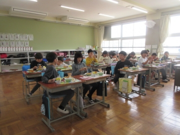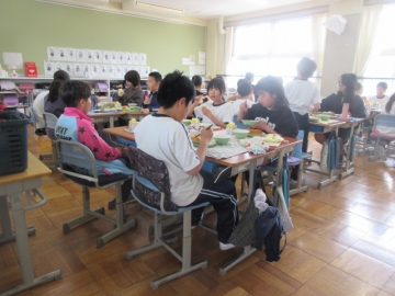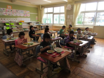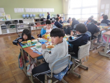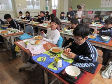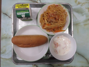 今日もみえ地物一番給食の日。今日の献立のうち、「三重豚のスパゲッティ(豚肉、エリンギ)」「フルーツトマトヨーグルト(みかん、ヨーグルト)」には、三重県産の食材が使用されました。「スパゲッティおいしい」「おかわりする!」と、配膳のあとは、おいしくいただきました。落ち着いて給食の時間を過ごせているのもすばらしかったです。