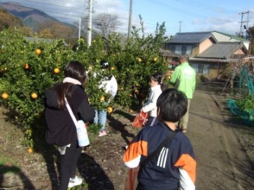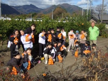 地域の学校支援ボランティアさんにお世話になり、2年生の子どもたちが、農園でみかん狩りをさせていただきました。先日、わらでリースやしめ縄を教えていただいたこともあり、「おはようございます。よろしくお願いします!」と元気よく自分たちから挨拶をしてスタートしました。最初に、ミカンの種類や収穫の仕方のコツなどを教えていただきました。早速、収穫を始めると、だんだん上手になってきて、最後には抱えきれないくらいのみかんを収穫しました。収穫の喜びと地域の方の温かさを、体験を通して学ぶことができました。   |