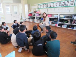 読書指導員の皆さんによる「朝の読み聞かせ」がありました。月1回、朝学習の時間に来ていただいています。人数の少ない学年は教室の後方に集まって座って、絵本を読み聞かせてもらいながら、指導員さんと楽しくお話をしていました。指導員さんが「低学年の子どもたち、本当にかわいい。目がキラキラしている。」とおっしゃっていました。