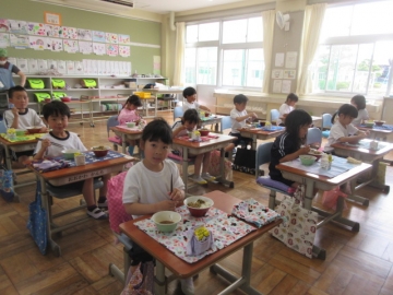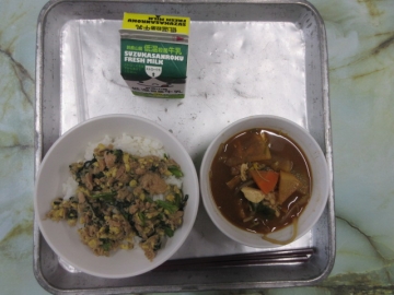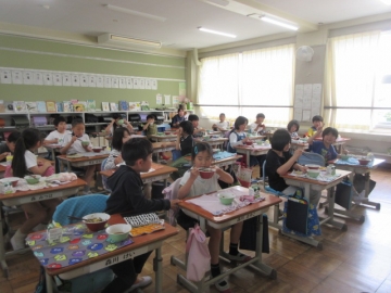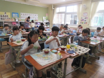15日、16日の給食は、三重県産の食べ物をたくさん使用する日です。今日の献立は、「ツナの三食丼、牛乳、地物たっぷり豚汁」です。どの学年の子どもたちも、自分の食べる量を調整しながら、三重県産の食材を味わうことができました。