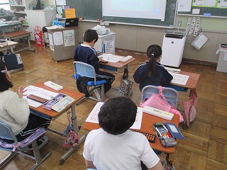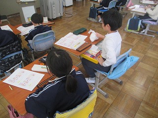 算数の時間にそろばんをはじきました。全国珠算連盟発行の冊子に、そろばんを扱うための動画があって、それを使って順番に進めていきました。本日は2桁+2桁の足し算で、繰り上がりとかはなく、そろばんを使って数を読んだり、数を置いたりするのを確認していました。