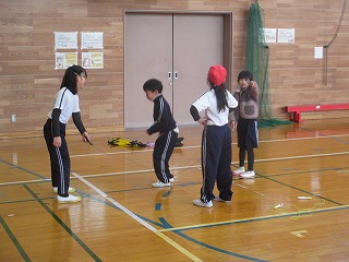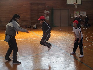 久しぶりに、3,4年生の合同体育をのぞいてみました。体育館で縄跳びをやっていました。合同なので、普段よりは人数が多いので、活気があっていいですね。3,4年生それぞれのグループに分かれて、縄を回していました。4年生のグループでは、縄を回している間に入って、もう1つの縄を使って縄跳びをしている子がいました。「こんなこともできるんだぁ」って驚きました。