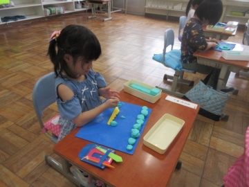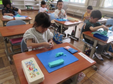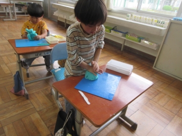 図画工作科の授業の一場面です。静かに教室に近づくと、子どもたちはお話もせずに、集中して粘土を使って思い思いの作品を作っていました。手でしっかりこねる、へらを使って切り分ける、部品を作って組み立てる、平らに伸ばしてきれいな形に整える…1年生の子どもたちのオリジナル作品を作ることができました。