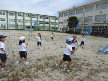 ようやく秋らしさを感じるようになってきました。1年生が、生活科の学習で虫取りをしました。一人ひとりが虫取り網を持って、いざ運動場へ。飛び回るとんぼを見つけますが、なかなか上手につかまりません。それでも何度も挑戦して、やっと捕まえることができました。夏には見られなかった虫を見つけることで、四季の移り変わりに気づくことができました。