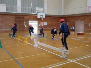 最初の活動は、いろいろな教具を活用したコースで、走ることを楽しみました。小刻みに床を踏みつけるようにステップを踏んだり、左右に片足ずつステップを踏んだりと、全部で6つのコースがありました。子どもたちは、何度もコースに挑戦し、スピードを上げて進むことができるようになっていました。