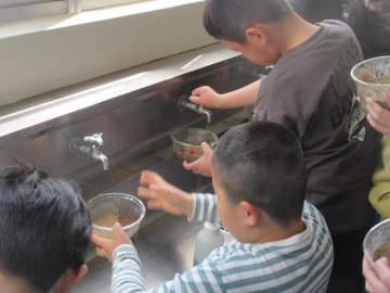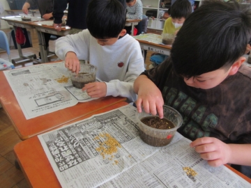 1限めに5年生が、地域の南川さまにお世話になり、もち米の種植えを行いました。水沢小では、米作りの学習の一環として種植えから始めます。種から芽が出ている様子を観察した後、土を入れたカップに水を張り、種を植えました。「土に水を張るときは、土の高さを超えないように」「種は観察しやすいよう、ポットの周りから蒔くように」など、南川さんのお話をしっかり聞きながら、種を植えました。芽が出て苗が育つと、5月初旬には苗を植えます。それまでしっかりとお世話と観察をしていきます。