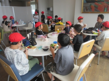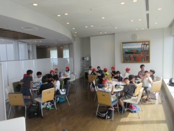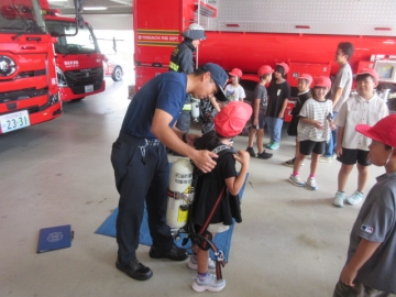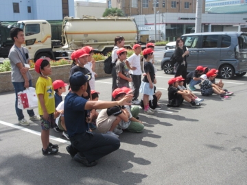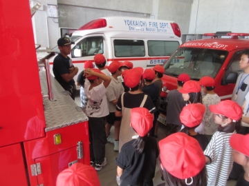 3年生が社会科「火事から人びとを守る」の学習の一環で、四日市市南消防署を見学しました。はじめに消防士のみなさんが訓練をしている様子を見せていただきました。火災現場で2階に取り残された方を救助するという想定。はしごを上り、安全確認をした後、中にいる人(人形)をゆっくりと地上へおろしていきます。緊迫した空気の中、落ち着いて安全に救助する様子を、子どもたちもしっかりと見ていました。その後、ボンベの重さを体感したり、消防車や救急車などの車両見学をさせていただきました。それぞれポンプ車やタンク車など、車両にもそれぞれ役割があることを学びました。会議室に戻ると、消防の仕事などについて、子どもたちからの質問タイム。「はしご車のはしごは何mありますか」「消防隊は何人いますか」「消防車と救急車の出動順はあるんですか」など、子どもたちが事前の学習で疑問に思ったことを質問しました。 教科書や資料で学ぶだけでなく、実際に見たりきいたりすることで、さらに実感が深まる見学となりました。   見学の後は、ポートビルで昼食。暑さが戻ったこともあり、12階のカフェテラスでいただくことができました。  |
