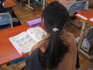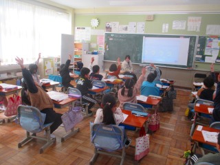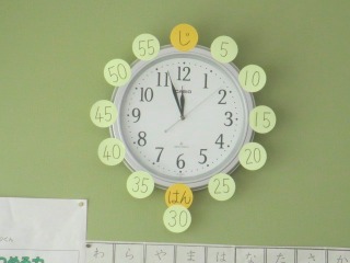 日常生活で時計を読めるようにな授業の様子(1年生)ることは、とても大切なことです。8時30分を8時半と言うことも、これから学習していくことになります。教室にも時計が設置してありますので、なかまと今の時間を言い合ったりするのもいい学習になると思います。
