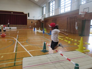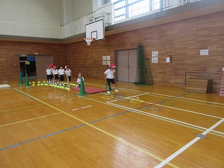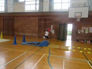 昨日の2年生に引き続き、今日は1年生で平均台や跳び箱、マットなどを使った運動遊びを行いまいした。授業のねらいは、体を動かす楽しさや心地よさを味わい運動好きになること。片脚跳びや両脚跳び、平均台の移動、跳び箱から高くジャンプ、低い姿勢で移動など、多様な動きを繰り返しながら、運動の場を楽しみました。「次はもっと高く跳ぼう」「スピードを上げてみよう」など、1年生なりに遊びを通して体の使い方を工夫することもできました。    |