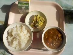 今日の給食は、米飯、牛乳、ポークカレー、枝豆サラダでした。