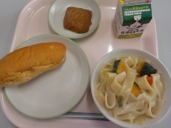 今日の給食は、小型玄米パン、牛乳、ほうとう、いなりの煮つけでした。今日も学校給食週間メニューでした。今日のメニューは山梨県の郷土料理「ほうとう」が出ました。小麦粉を平たく切った麺と野菜を煮込んだ料理です。