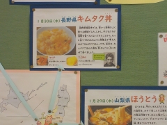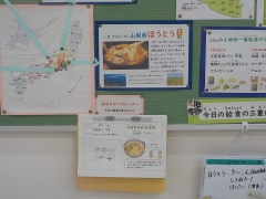 山梨県でのほうとうが発展した背景をビデオで見ている学級もありました。各県の郷土料理を味わることで旅行にでかけた気持ちになれますね。