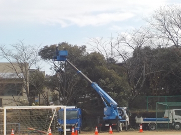 学校の樹木剪定に業者の方が来てくれました。外に伸びた枝をクレーン車を使って作業していただいています。