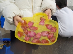 子どもたちは大喜びで容器をもっていました。寒さで大人は大変ですが、子どもたちは様々な楽しみがあるようです。冬の寒い日にしか体験できない体験なので、このような体験から日常の不思議について興味をもてるといいですね。