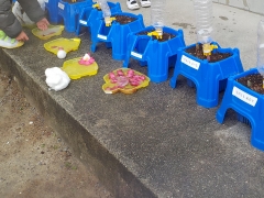 教室の犬走で子どもたちが容器に好きな花びらなどを入れて一晩おいておくことできれいな氷ができていました。