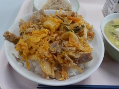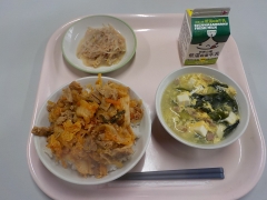 今日の給食は、キムタクどん、牛乳、ツナともやしの和え物、わかめと卵のスープでした。