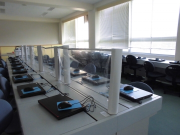 飛沫感染防止のため、PC室の向かい合っている机の間についたてを作成しました。