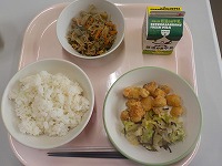 今日の給食は、米飯、牛乳、タラの香味あげ、こんぶあえ、五目きんぴらでした。