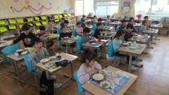ごはんです。1年生も小学校に入学してから初めての給食でしたが「おいしい!」「もっと食べたい」といいながら食べていました。どの学年もおいしそうに給食を食べていました。調理員さん、ありがとうございます。