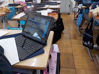 家庭科の時間、学校の汚れがある個所を調べて、そうじの計画を立てるようです。子どもたちは、さっそくタブレットをもって学校中を調べて汚れがひどいところを撮影していました。