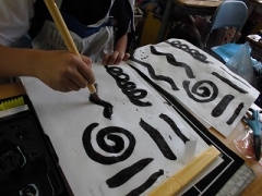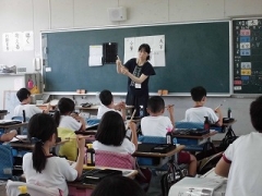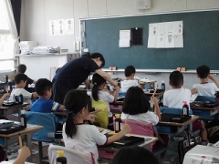 3年生から始まる毛筆にゲストティーチャーを招いて指導していただきました。初めての毛筆で、子どもたちはやる気満々です。姿勢や道具の使い方から教えていただき、筆の持ち方を一人ずつ確認していただきました。その後、墨をつけて実際に書いてみました。毛筆の初めの指導をしっかりとしていただき、これからの毛筆の学習が楽しみです。