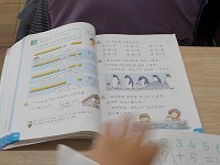 算数の時間、くり上がりのあるたし算を学習しました。9+5=の計算の仕方を子どもたちが説明しました。9+5で「9に1たして10をつくり、・・・」と子どもたちが頭の中で計算している方法を説明しました。