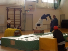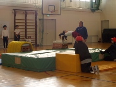 体育の時間、跳び箱運動で中学校につながる技として頭跳ね跳びに挑戦しました。台上前転からの発展した技で子どもたちも安全に気をつけながら練習しました。