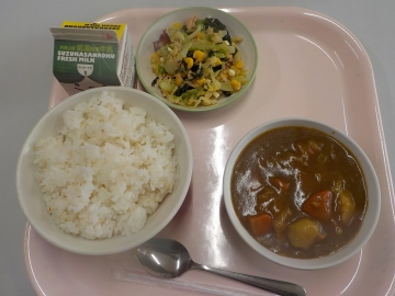 今日の給食は、米飯、牛乳、ポークカレー、チーズ入り海藻サラダでした。子どもたちは、カレーライスにしておいしくいただきました。