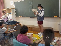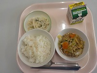 今日の給食は、米飯、牛乳、八宝菜、春雨サラダでした。給食中に給食委員会の人が今月の給食メニューの紹介に来ました。「よくかんで食べましょう」の給食目標を紹介して、かむことについての意義を話してくれていました。