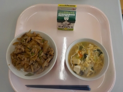 今日の給食は、三重豚丼、牛乳、かきたま汁でした。今日の給食は地元一番給食でした。三重豚丼は、豚肉、エリンギ、かきたま汁は、はくさい、小松菜、豆腐、たまごが三重県産の食材でした。はくさいは、四日市市県地区で作られたものでした。