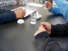 理解の時間、理科室で塩を溶かして実験をしていました。決められた食塩を水に溶かし何グラム溶けるのか、調べていきました。班で協力しながら水をかき混ぜたり、塩を入れたりしながら確かめています。