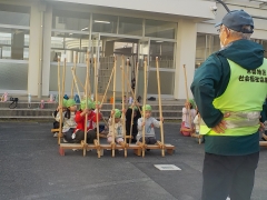 社会福祉協議会の方が見本を見せると「すごい」と子どもたちから歓声が上がりました。子どもたちの遊びが変化している昨今、昔の遊びを通して身体を動かしていくことが大切です。