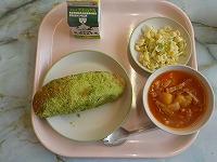 今日の給食は、緑茶あげパン、牛乳、野菜のトマト煮、マカロニサラダでした。子どもたちに大人気のあげパンが出ました。四日市市特産のお茶の風味のあげパンで、調理室で揚げてもらいました。